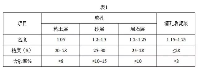 开钻前制备质量,数量都能满足要求的泥浆,防止在钻孔灌注桩的施工过程中发生坍孔。采用澎润土制备成泥浆进行护壁,稳定孔内水位。适当提高泥浆比重,控制好泥浆的质量,充分利用泥浆与地下水之间的压力差来控制水压力,以确保孔壁的稳定。根据不同的土质情况,泥浆指标控制如下: